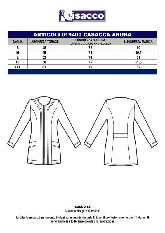 La casacca Aruba è una camicia da donna a manica lunga bianco. Adatto al settore estetico, sanitario, alimentare e medico. come divisa da lavoro per aziende di servizi. Con bottoni a pressione, collo a girocollo e 2 tasche e vestibilita sciancrata.