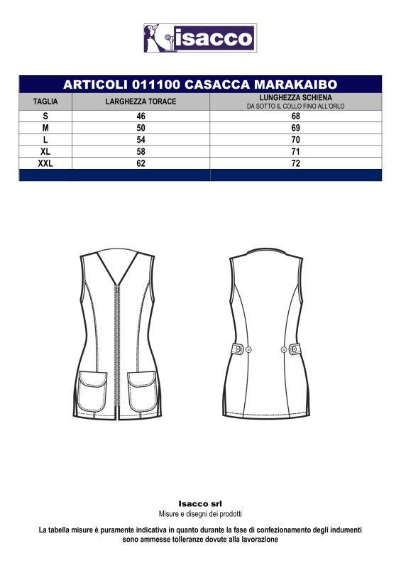 La casacca Marakaibo è una camicia da donna Senza maniche bianco. Ottima per settore medico estetico sanitario e alimentare. Utilizzata come divisa da lavoro per aziende di servizi. Con cerniera e due tasche.