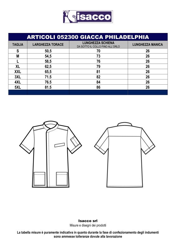 La casacca Philadelphia è una giacca da uomo a mezza manica nero. Adatta al settore sanitario, estetico e alimentare. Utilizzata come divisa da lavoro per aziende di servizi, pulizie, industria. Abbottonatura nascosta antinfortunistica, bottoni a pressione, tasche e taschino.