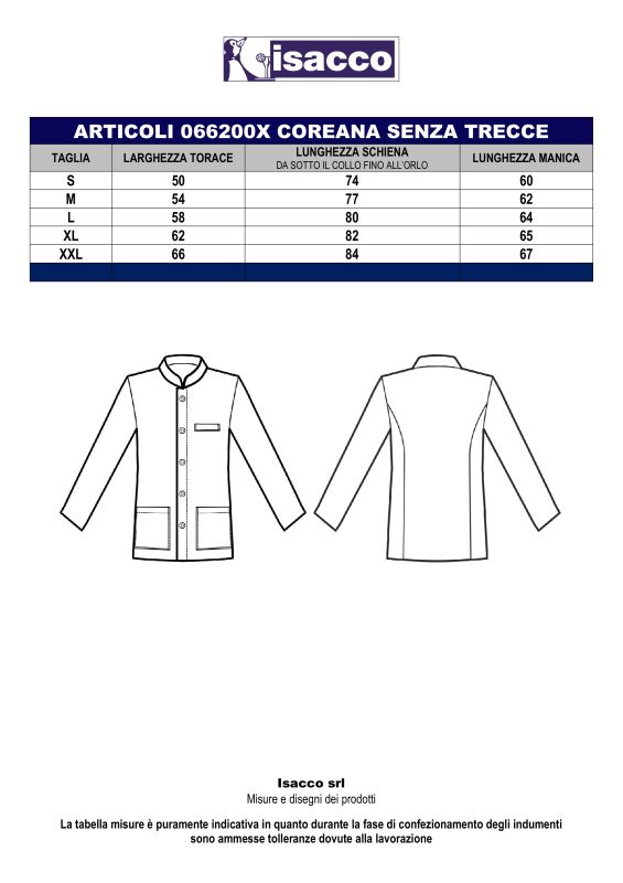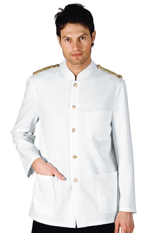 Casacca Coreana con trecce bianco. Ideale per settore alberghiero e ristorazione. Divisa da lavoro per facchino, fattorino, ristoranti e catering. Con 2 tasche applicate. 100% poliestere 220 gr/m².